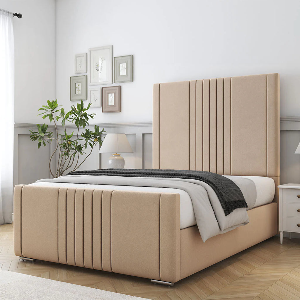 Introduce timeless sophistication to your bedroom with the Eva Royal Bed Frame, a beautifully designed luxury bed crafted for comfort, elegance, and durability. The standout feature of this premium frame is its vertically lined padded headboard, offering a refined, modern aesthetic that enhances any style of décor.