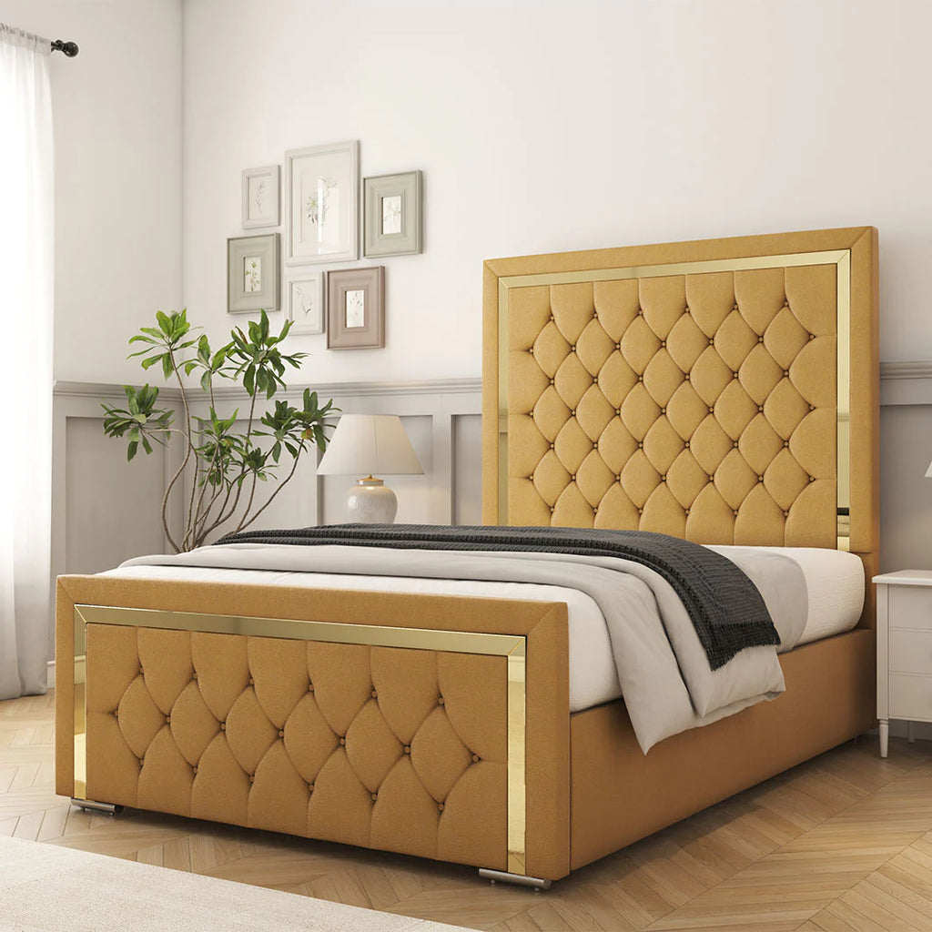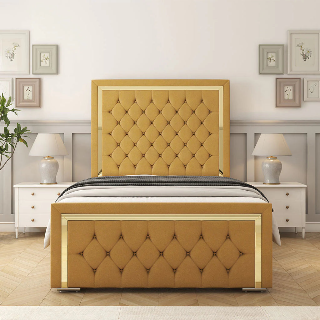 Transform your bedroom into a luxurious retreat with the Luxury Marry Gold Bed Frame. Designed with a sleek and elegant gold finish, this bed frame brings style, comfort, and durability together. Its robust construction ensures long-lasting use, while the refined design enhances the aesthetic of any bedroom. Ideal for pairing with your favorite mattress, the Marry Gold Bed Frame is available in multiple sizes to fit single, double, king, and super king mattresses. Elevate your bedroom décor with a bed frame that radiates luxury, elegance, and sophistication.