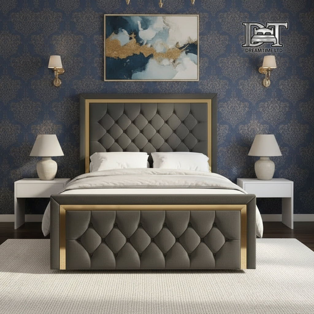 Transform your bedroom into a luxurious retreat with the Luxury Marry Gold Bed Frame. Designed with a sleek and elegant gold finish, this bed frame brings style, comfort, and durability together. Its robust construction ensures long-lasting use, while the refined design enhances the aesthetic of any bedroom. Ideal for pairing with your favorite mattress, the Marry Gold Bed Frame is available in multiple sizes to fit single, double, king, and super king mattresses. Elevate your bedroom décor with a bed frame that radiates luxury, elegance, and sophistication.