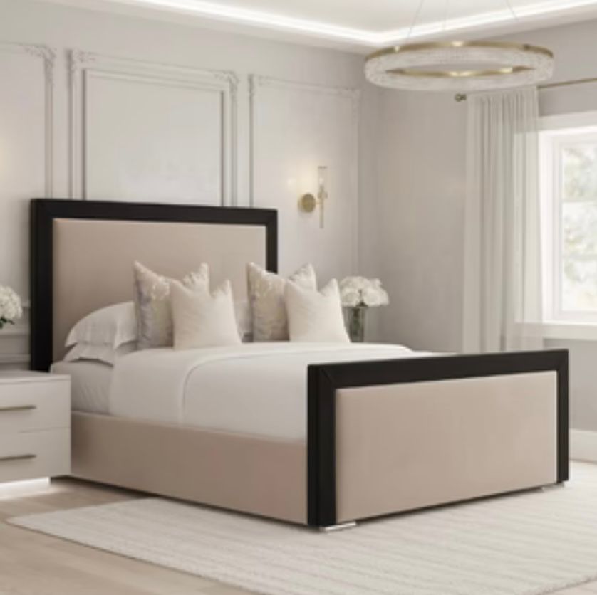 Expertly upholstered in luxury velvet, linen, or suede fabrics, the Vogue Bed Frame is available in a range of contemporary shades — from neutral tones to rich, bold colours. The contrasting black outline elevates its modern aesthetic, making it a true statement piece for stylish bedrooms.